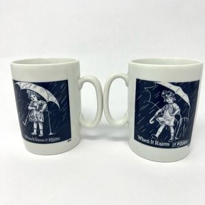 Umbrella girl, When it rains it pours, anniversary set, mugs, 1960s coffee set, handles, Old Enough, grocery getter, perfect nostalgic gift for that funny whimsical person in your life who shrugs their shoulders and carries on!