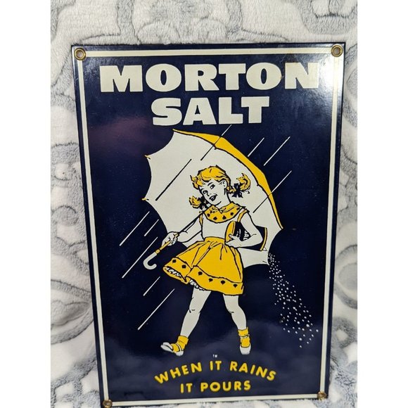 Morton Salt Vintage Porcelain Enamel Metal Sign When It Rains It Pours with COA