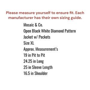 Mosaic & Co. Jacket Size XL Black White Diamond Pattern Open Short Pockets Lined