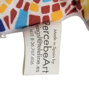 Colorful plush lizard stuffed animal made in Spain by PercebeArt. Features a bright mosaic tile print in red, yellow, blue, and orange with white underside. Measures approximately 9 inches long. Unique, and non-toxic—perfect as a decorative gift for reptile lovers.