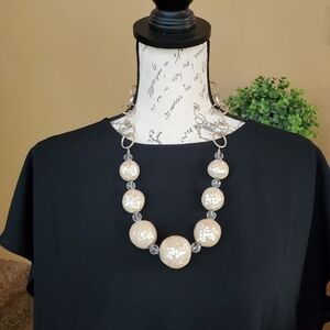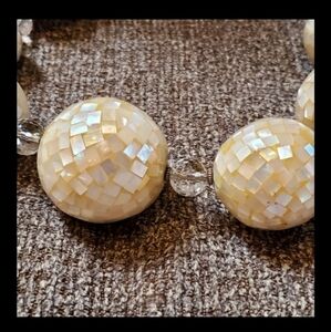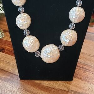 Handcrafted statement necklace with inlaid mother of pearl round beads and clear faceted Czech glass beads. Silver chain is hand forged lightweight circle links, adjustable. 24" length. Excellent used condition