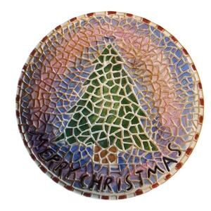 Mosaic Pillar Candle Plate Merry Christmas Tree