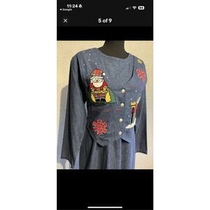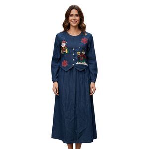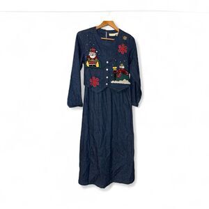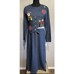 Mosaic Size 10 Twofer Denim Long Dress Embroidered Snowman Print Winter Teacher