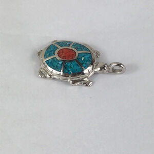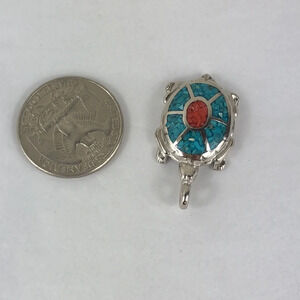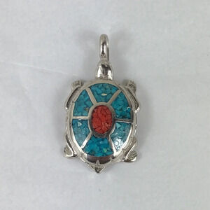 Mosaic Turtle Pendant Silver Turquoise Coral Inlay Vintage