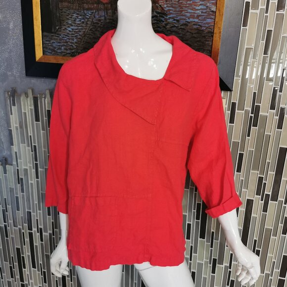 Mosaic USA 100% Linen red Frock Pocket Asymmetrical Neck Top L Lagenlook 0292