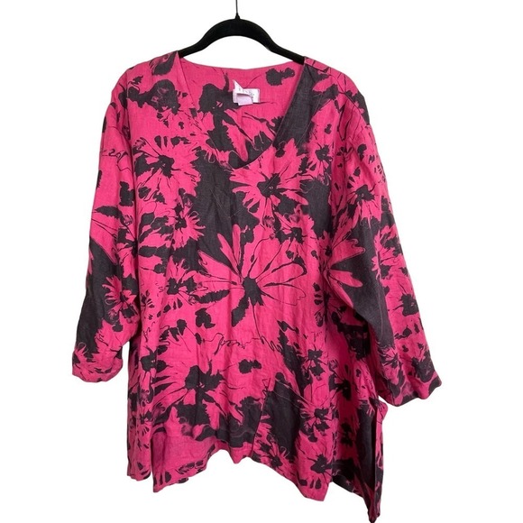 Mosaic USA Linen Lagenlook Top Asymmetrical Hem Red Black Floral Tunic Size L