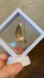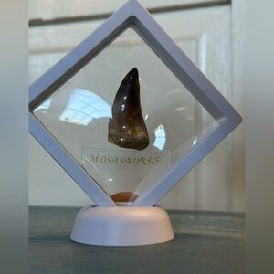 Fossilized Mosasaurus tooth in a white display case. Perfect for collectors.