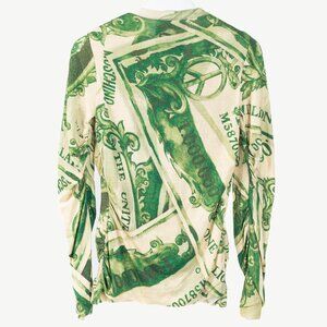 Made in Italy, this cardigan from Moschino's 2019 Autumn and Winter collection is crafted in a soft virgin wool knit in a green money print, and features long sleeves, a crew neckline, front button closures, ruching along the seams, fibbed finishings, and is lined in a beige mesh.