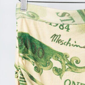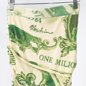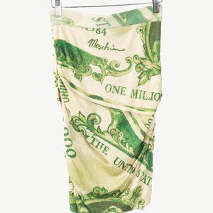 Made in Italy, this skirt from Moschino's 2019 Autumn and Winter collection is crafted with a soft virgin wool knit in a green money print, and features a ribbed waistband, ruched sides, a knee-length banded hem, and is lined in a beige mesh.
