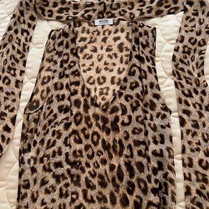 This unusual Moschino dress is made of a lightweight flowy silk fabric with a slip underneath. The low V neck has a scarf attached to the neckline by the shoulders. This scarf can be made into a bow or can be thrown over the shoulder covering the base of the neck and trailing down the back. The hem is low/high with it being shorter in the front and longer in the back and featuring a large ruffled edge. It measures 17" from pit to pit, with a 39" length from shoulder to the front hem and a 44" length from the shoulder to the back hem. The waist area measures about 30". I think it fits smaller than a 10 or a European 44. This is a stunning dress that I only wore twice - once on a cruise and once to a party. Unfortunately, it no longer fits me.
