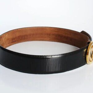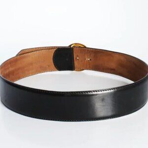 Preowned, vintage with signs of use, age and prior wear: some color loss and scratching to the gold metal buckle; some rubs,