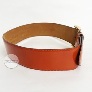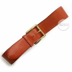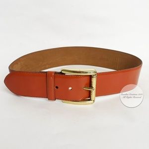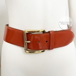 Authentic, preowned, vintage Moschino wide patent leather belt, made by Redwall most likely in the early 90s. Style 401205/Orange patent leather/gold metal buckle. Preowned/vintage with signs of prior use & wear: some light color rubs to areas of belt, hard to see when wearing but evident if inspecting closely. Tagged size 42: end-to-end length - 36.25in/buckle height - 3in/strap height - 2in/best fits waist between 26in and 28in.