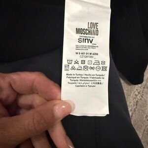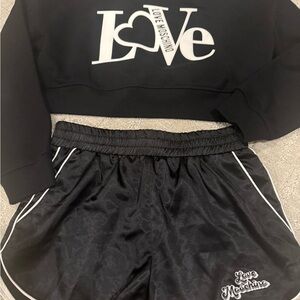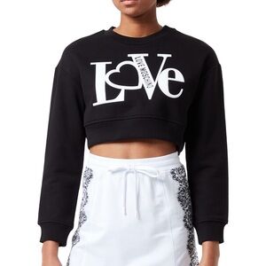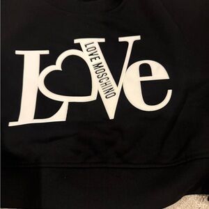 The Moschino black crop hoodie sweatshirt combines casual comfort with a chic design. Crafted from a soft sweatshirt material, it features a bold 'LOVE' print in white across the front. The cropped style and ribbed cuffs add a modern touch, making it a versatile addition to your wardrobe. LIKE NEW