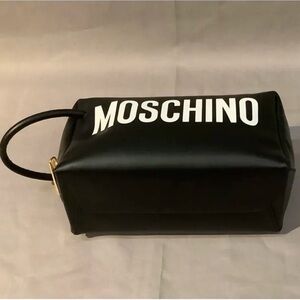 Black toiletries bag. Moschino logo. Zip top. Side handle. Excellent pre owned condition. (9.9/10)