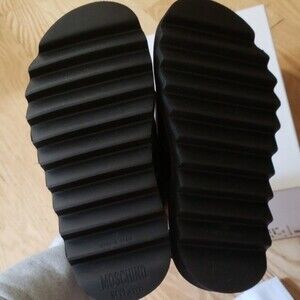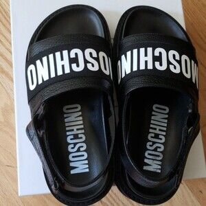 Stylish black sandals with bold Moschino branding. Comfortable and chic design.