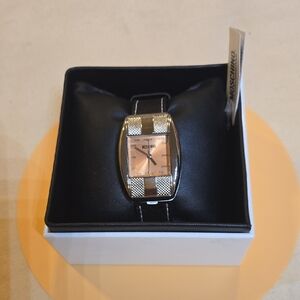 Stylish Moschino "smartwatch" with a chic black and silver look. Ideal for modern wear. Watch face is a pale rose and strap is a deep brown leather and literally tells you what you should be doing so in that regard, it is very smart!New with tags in original box with top only ready for wear or gift ๐!