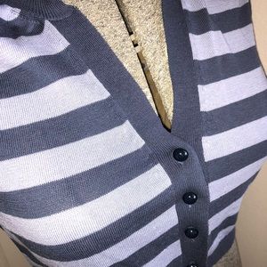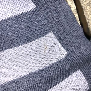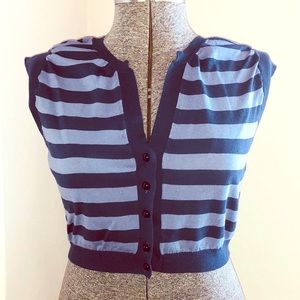 Super cute Moschino crop top. Worn only twice. Striped blue pattern And closes at the front with buttons. Small short sleeves and fabric detailing on the edges. Deep neck line. Barely there fabric piling on the back and small stain shown in pictures. 100% cotton.
