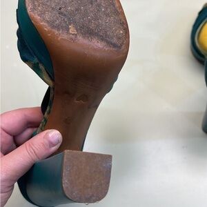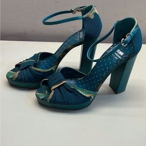 These Moschino heels boast a vibrant blue and yellow color palette, highlighted by multiple criss-cross straps for a secure and stylish fit. The chunky heel and slight platform offer both height and comfort, making them a bold choice for any occasion.