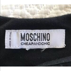 Moschino Cheap & Chic little black dress. Dress is a sleeveless scoop neck with a very cute little asymmetrical hem. Dress no longer has size tag but is measuring about a woman's size small. Also missing fabric content tag so I'm calling it a cotton blend.