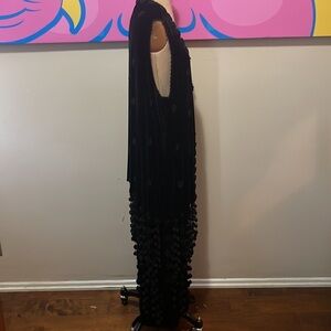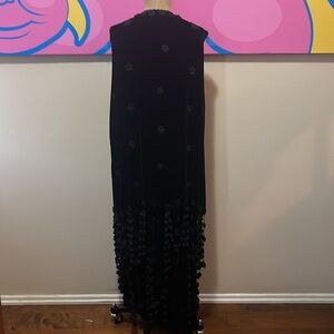 Be retro glam wearing this unique Moschino velvet skirt and long vest set with unique crochet fringe.