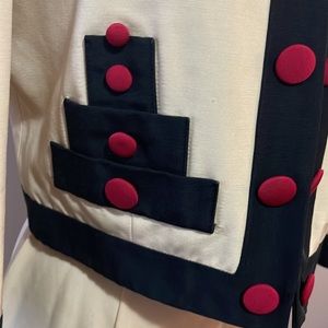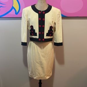 Be retro glam wearing this unique suit by Moschino Cheap and Chic. Boxy style jacket with snap closure. Small spot on back of jacket. Some dirt on one shoulder and slight discoloration.