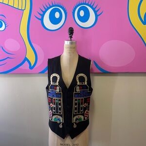 Do Las Vegas in style wearing this vintage vest by Moschino Cheap and Chic. Fun embroidery on the front and lucky horse shoes! Pair with a collarless long sleeve white or black shirt and dark jeans for a finished look.