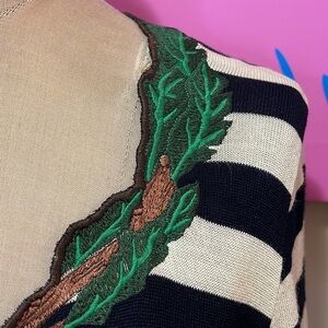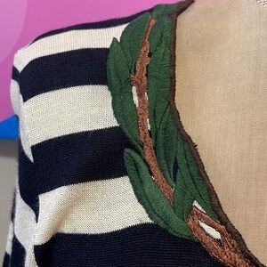 Be retro glam is this vintage Moschino Cheap and Chic dress. It has sailor vibes with unique laurel leaves embroidered collar and red bow. Small prick in fabric. Slight piling.