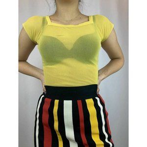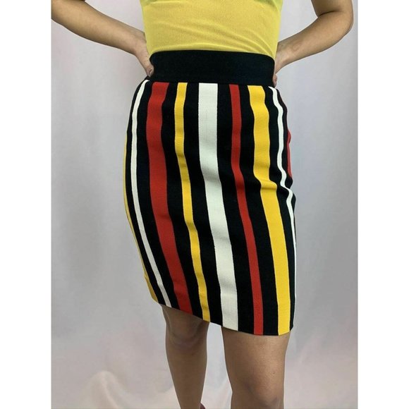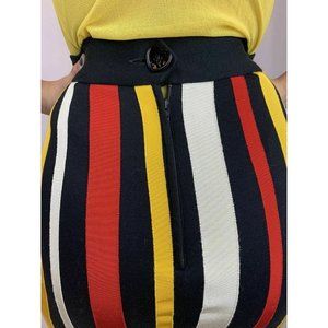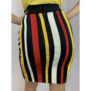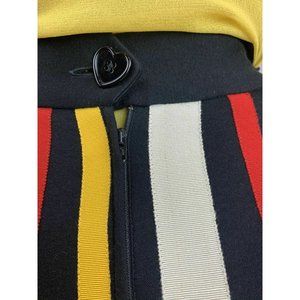 Fun and striking black Moschino Cheap and Chic pencil skirt with red, yellow, and cream colored vertical stripes. Darling heart button closure in back with zipper.
