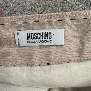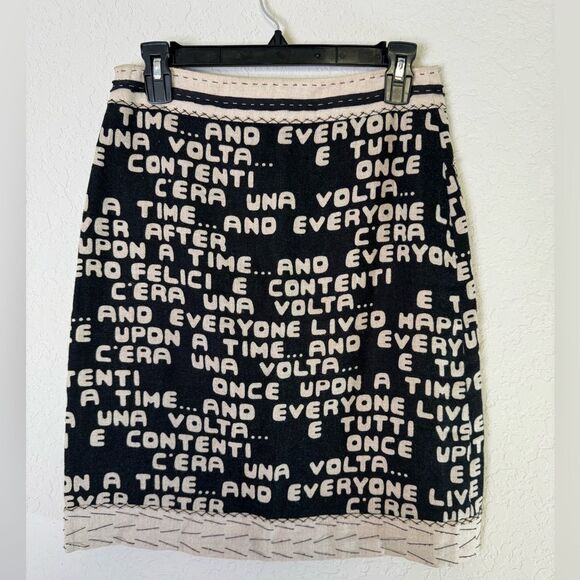 Ultra-rare archival Moschino Cheap & Chic mini skirt featuring a bold all-over "Once Upon a Time..." text print in both English and Italian. Features patch-style pockets, visible raw stitching, and Moschino’s signature playful, ironic storytelling aesthetic. A collector’s Y2K-era piece perfect for statement dressing.