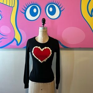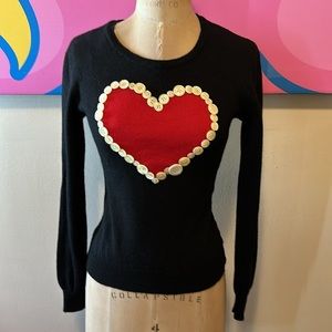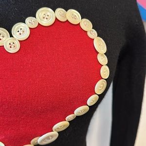 Be retro cool wearing this fun wool sweater by Moschino! Fun red heart is outlined in buttons! Pair with black pencil pants and boots for a finished look.