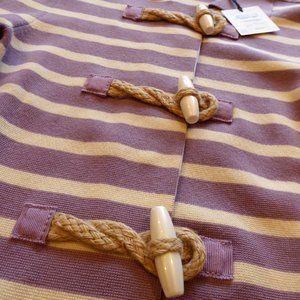 A brand new Moschino Chep and Chic Ladies, Knit Sweater Jacket in a beautiful lilac & cream/ivory stripe design. The jacket has stunning burlap twisted toggle closure with white toggle buttons and snaps on the inside to ensure the jacket stays closed. Two front slit small pockets. This jacket was made in Italy and is an Italian Size 44, USA Size 10, but it runs a bit on the smaller side for a normal size 10, for that reason we ask that you double check the measurements we post below to be sure it will fit you well. The jacket label is marked USA 10, but the store where it was purchased marked the label US size 8. Please double check the measurements. Photos taken with and without flash.