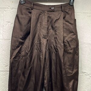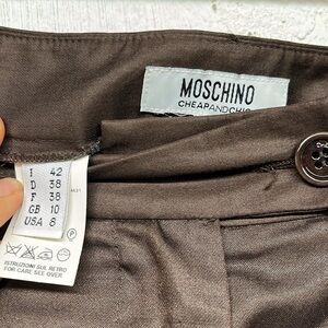 Moschino CheapandChic high rise dress pants brow sz 8. Straight leg fitted at waist. Flawl at waist as pictured. Otherwise good condition . Approx measurements flat: waist 14, rise 12, inseam 30. Fits more like a 6 IMO, especially since super high waist