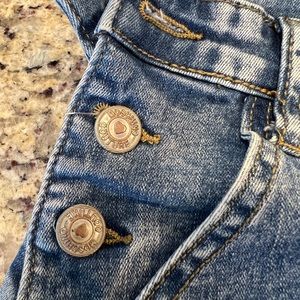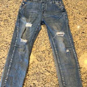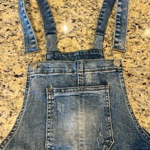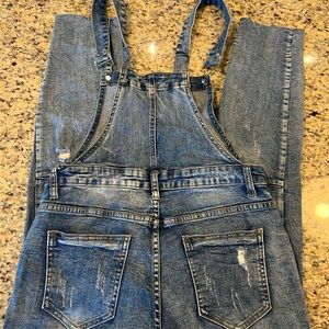 Moschino Couture Distressed Overalls. Item is in excellent condition but please note all interior tags have been removed. Moschino Couture Logo on all buttons. Great piece for spring and summer!