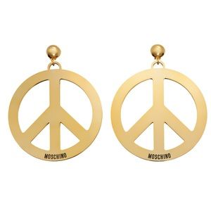 Bold gold earrings with peace sign design. Iconic Moschino style.