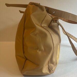 Chic Moschino shoulder bag in tan. Features a striking gold logo.