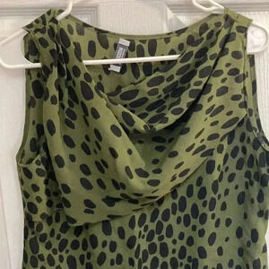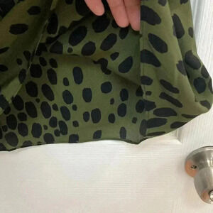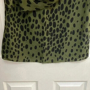 100% silk blouse in green with black spots, animal print. Layered fabric at the chest for interest. Perfect for the office or working from home Zoom calls!! The tag is detached on one side. “Cheap & Chic”.