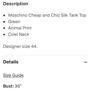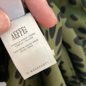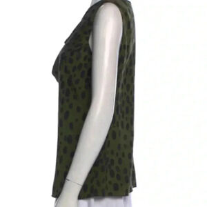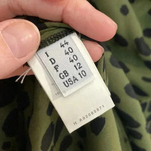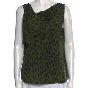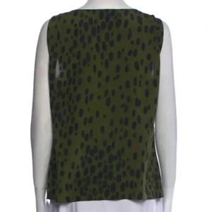 100% silk blouse in green with black spots, animal print. Layered fabric at the chest for interest. Perfect for the office or working from home Zoom calls!! The tag is detached on one side. “Cheap & Chic”.