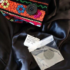 DETAILS: Fully lined. 3 button close. Colorful vibrant pattern on black with a floral and logo stripe pattern. Baby fine corduroy or velvet like texture. Retro 80's 90's vibe.