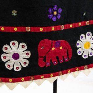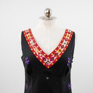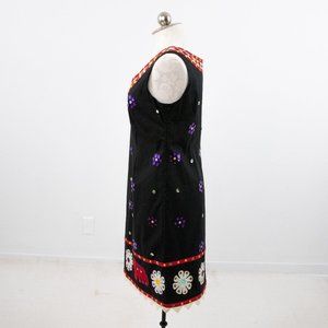 Vintage Moschino Cheap & Chic mini midi dress in crisp stretch cotton. Wide strap sleeveless v-neck shift, knee length. Lined. Embellished w flowers sequins beads, embroidered trims & elephants, zig zag hem. groovy 70s boho vibe! EUC.