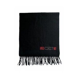 Luxurious and soft Moschino merino wool scarf in classic black with bold embroidered MOSCHI?NO logo detailing. Lightweight but warm, perfect for fall and winter layering. Features fringe trim and premium feel.