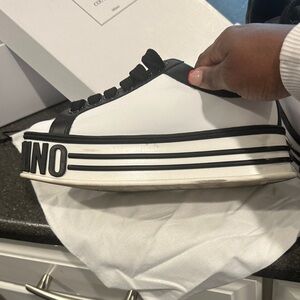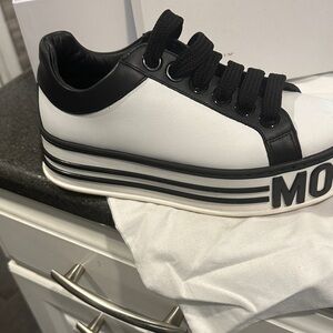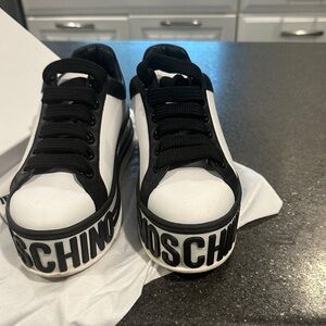 Chic Moschino sneakers with bold logo. Monochrome design with lace-up style.