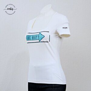 Moschino One Way Square Neck Distressed Short Sleeve Tee White Blue Women S
