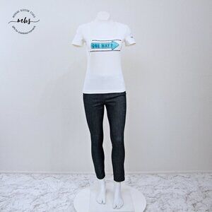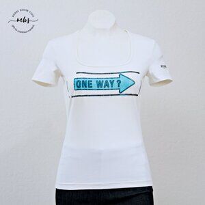 Moschino One Way Square Neck Cracked Distressed Screen Print Short Sleeve Tee White Blue Women S