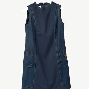 Made in Italy, this suitwear-inspired shift dress from Moschino's 2023 Pre-Fall and Winter collection is crafted in a mix of navy virgin wool and a tonal cotton blend, and features a sleeveless design, a round neck, front welt pockets with a patch on the left, a mini-length hem, tonal piping and contrast stitching, an invisible back zip closure, and is lined in a tonal satin.