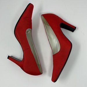 Be retro glam wearing these rare pumps by Moschino with question marks on the heels! Red fabric. Embroidered at heels. NO BOX.