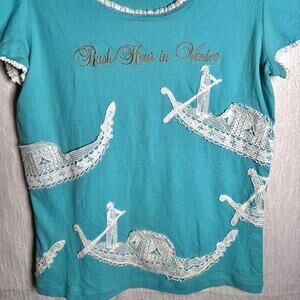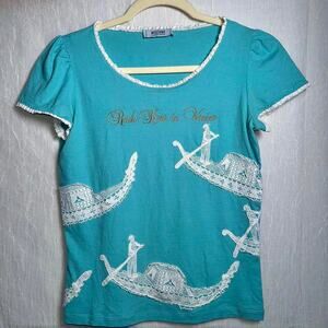 Moschino “Rush Hour in Venice” Light Blue Crochet Detailed Tee - Size Small
