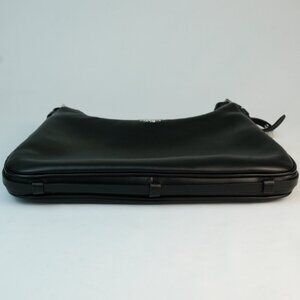 This shoulder bag features a smooth calfskin leather exterior with logo lettering on the adjustable handle.