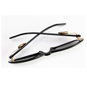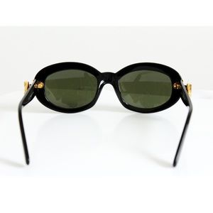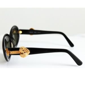 Preowned, authentic and vintage Moschino x Persol Ratti sunglasses. Made from black resin, these feature gold tone metal hearts on each side. Preowned with minimal signs of use: some very light scratching to frames and lens. Measurements: eye size - 2in, temple size - 5.75in, bridge - .5in. No eyeglass case but will be packaged carefully for shipping.