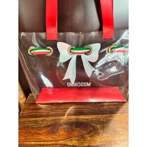 A rare vintage find! This Moschino clear tote features the iconic Italian tri-color design with bold Moschino logo accents. Perfect for collectors or anyone wanting a standout statement bag. In good vintage condition with some light scuff marks consistent with age.
