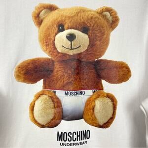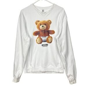 Charming white sweatshirt with a playful teddy bear design. Iconic Moschino branding adds a stylish touch.